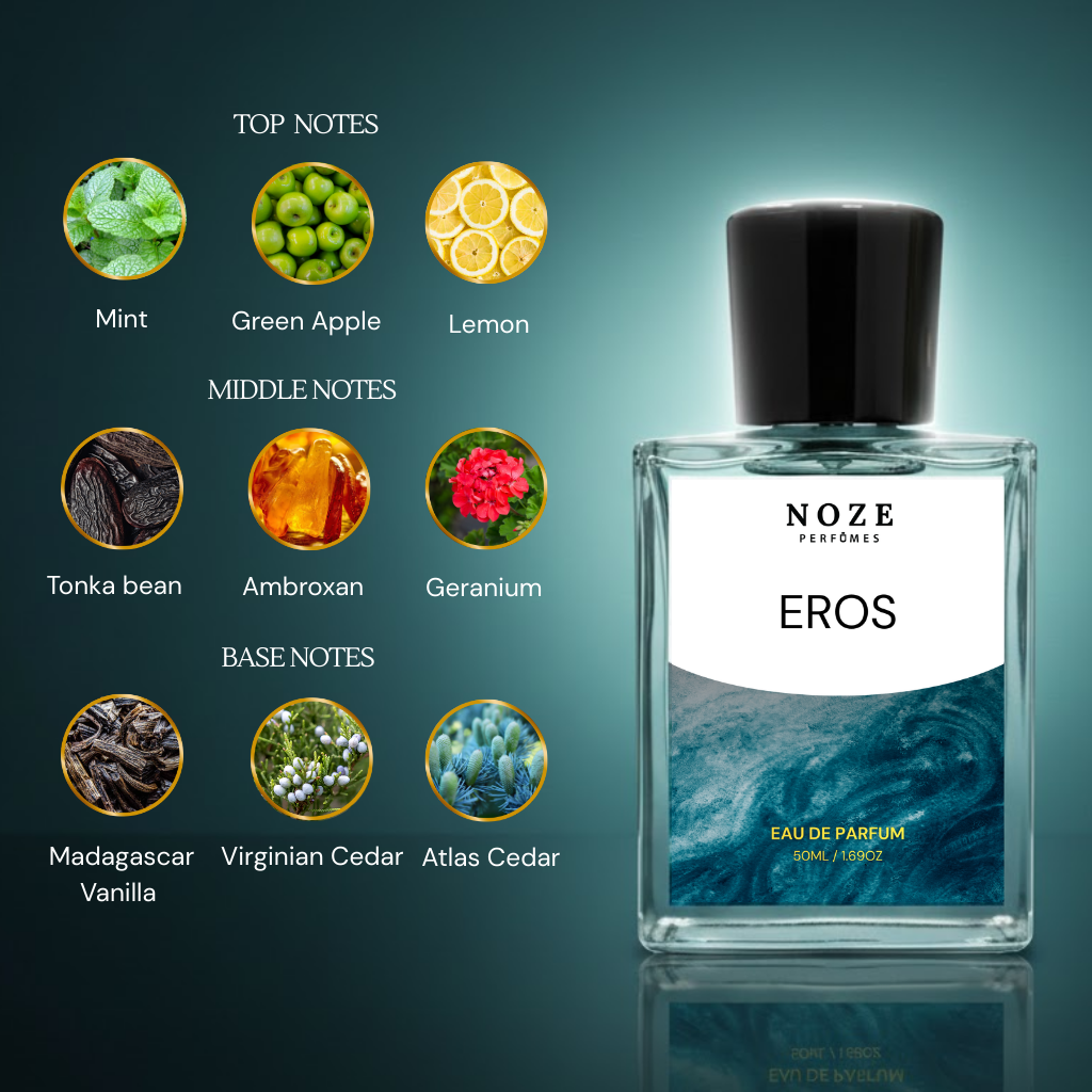 Discover Noze Perfumes’ Eros Recreated Luxury Perfume – a seductive, long-lasting scent with 30% perfume oil and 95% scent accuracy. Mint, green apple, citrus, vanilla & deep woods create a bold masculine fragrance at an affordable price. Shop premium recreation today!
