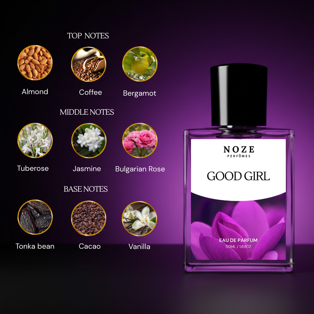 Discover Noze Perfumes’ Good Girl Recreated Luxury Perfume — a sweet, sensual, long-lasting scent with 30% perfume oil and 95% scent accuracy. Jasmine, tuberose, tonka bean, cocoa & roasted coffee create a bold feminine fragrance at an affordable price. Shop premium recreation today!