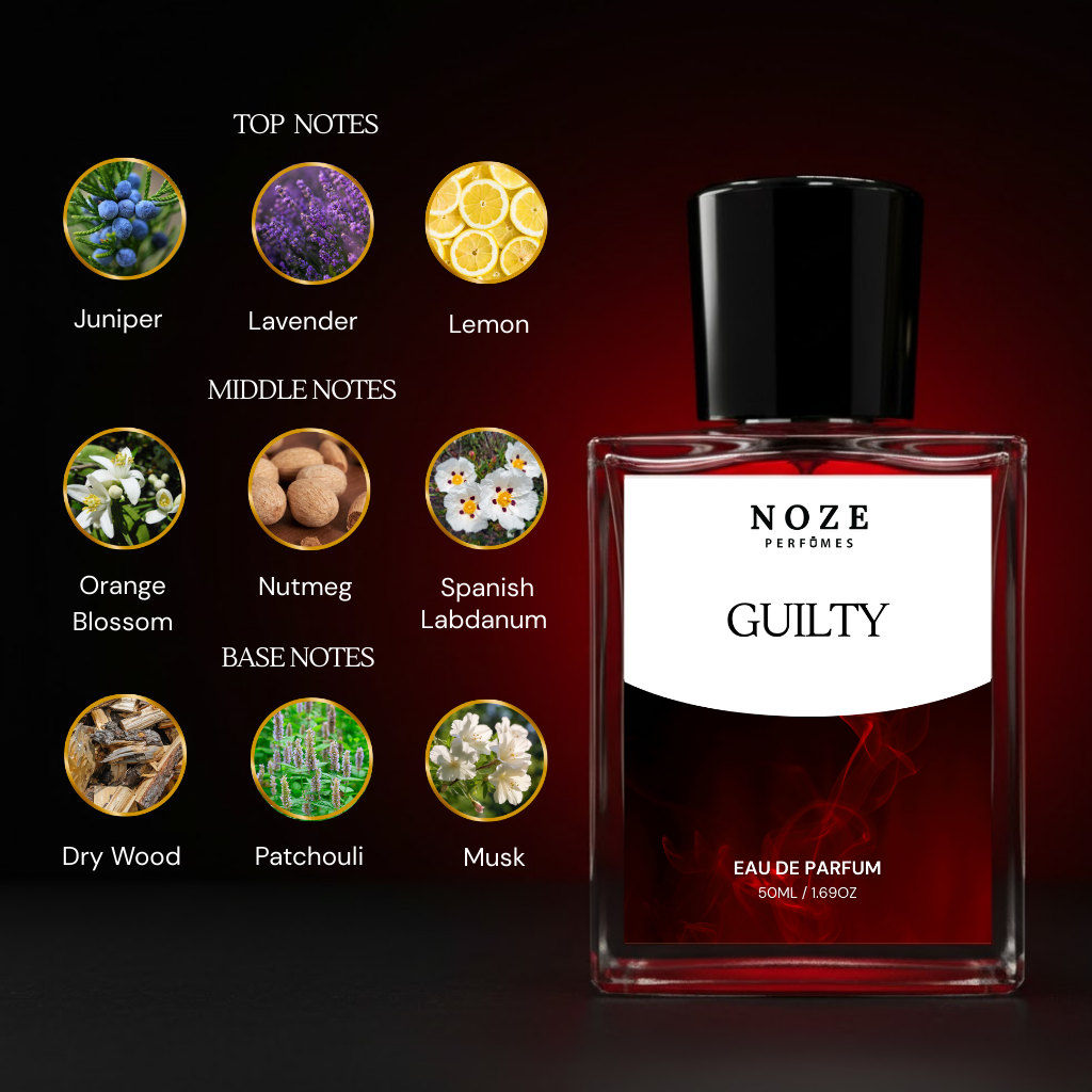 Discover Noze Perfumes’ Guilty Recreated Luxury Perfume – long-lasting scent with 30% perfume oil and 95% scent accuracy. Lemon, lavender, orange blossom, neroli, patchouli & cedarwood create a confident, modern fragrance at an affordable price. Shop premium recreation today