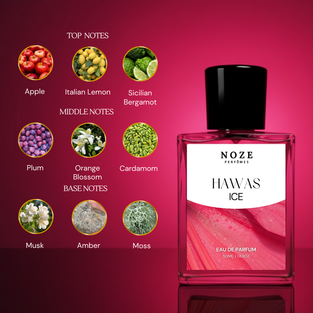 Discover Noze Perfumes’ Hawas Ice, Recreated Luxury Perfume — a fresh, long-lasting scent with 30% perfume oil and 95% scent accuracy. Lemon, bergamot, aquatic notes, lavender, amberwood, musk & cedar create a cool confident fragrance at an affordable price. Shop premium recreation today!